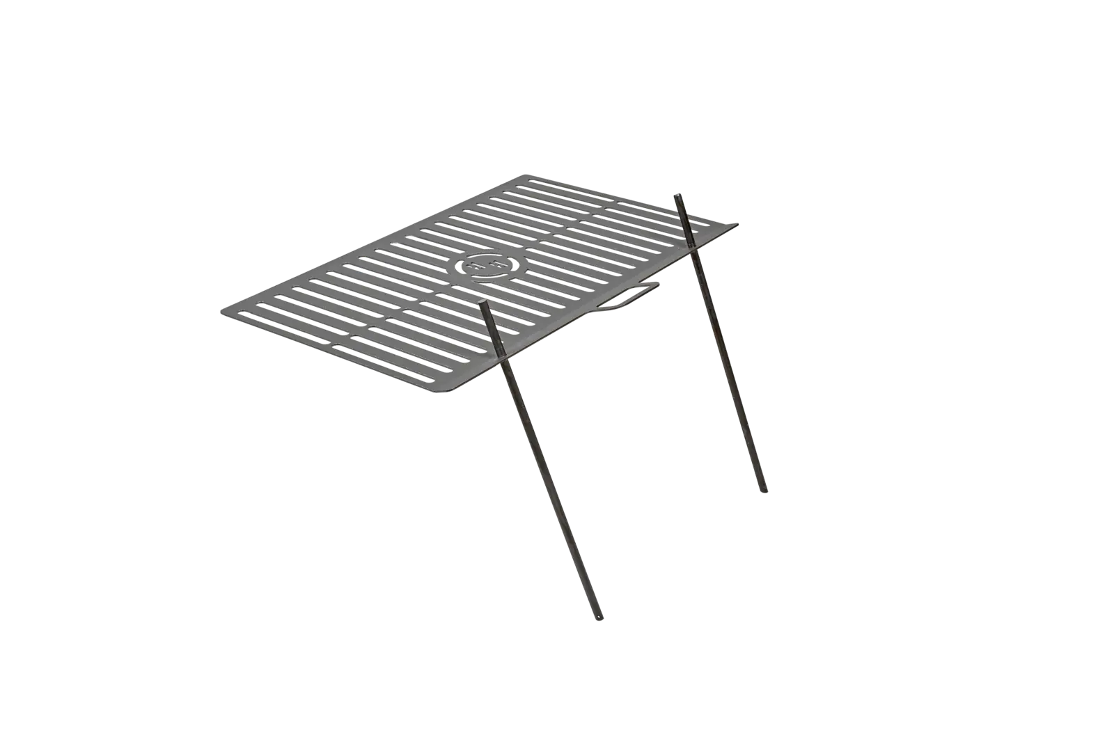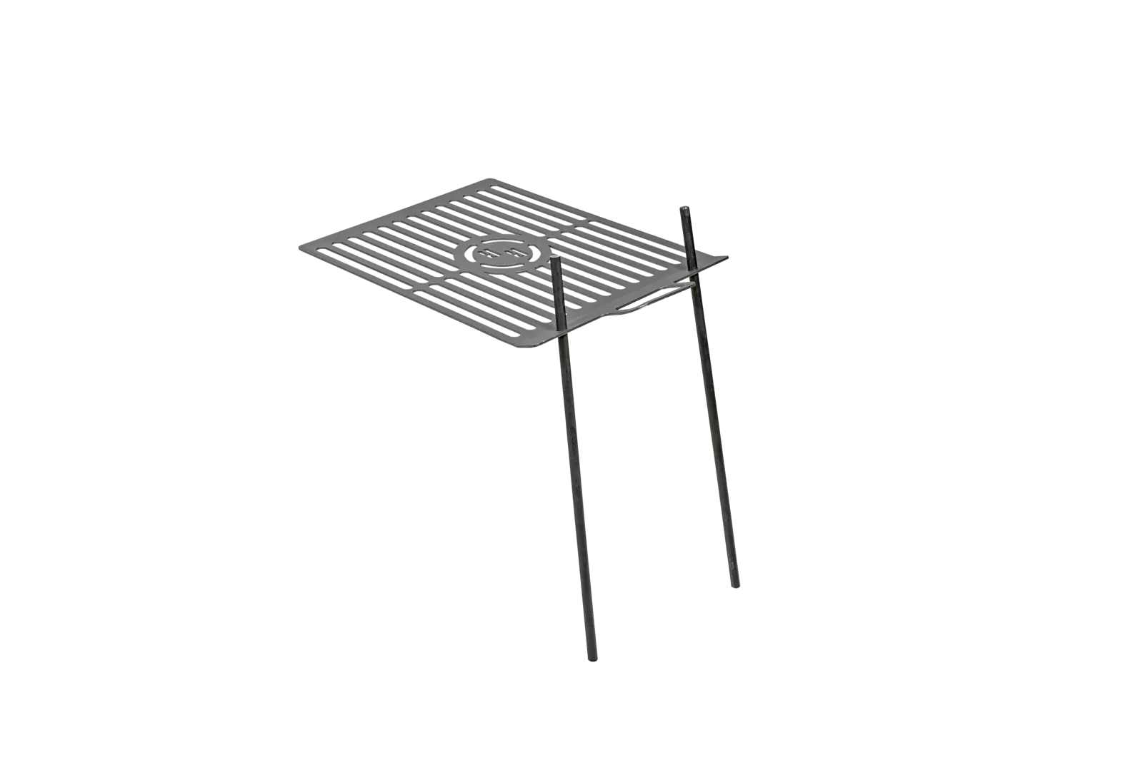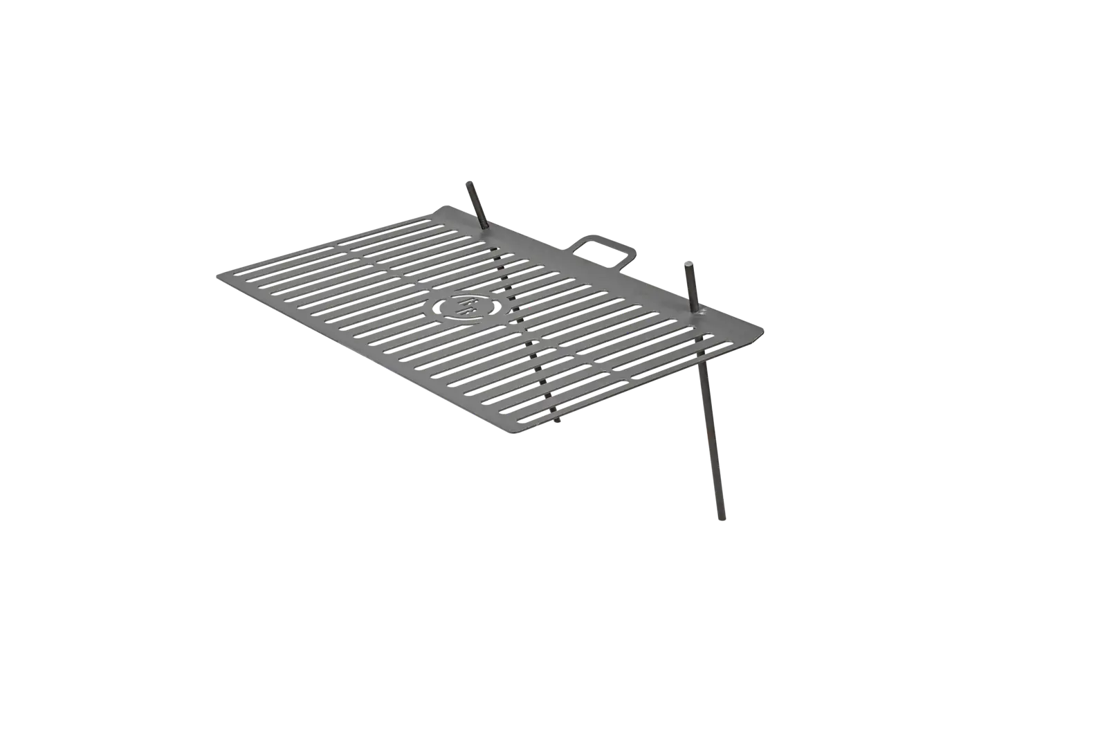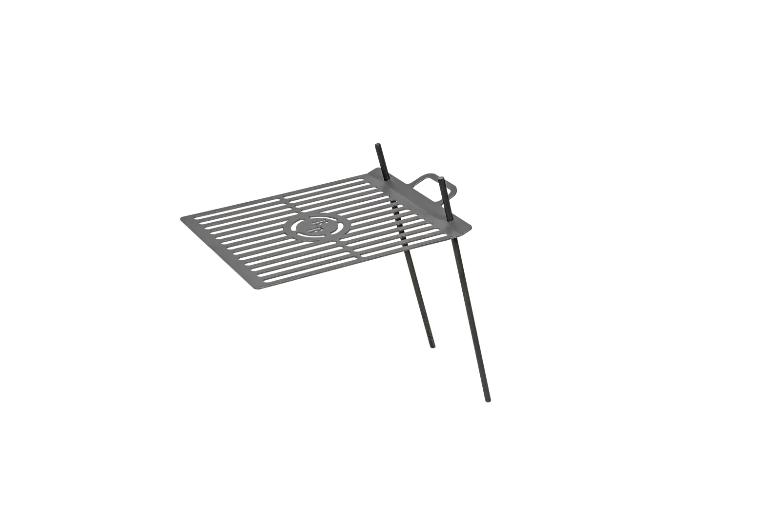 A rács két földbe szúrható pálcával rögzíthető a talajhoz, így stabilan elhelyezhető a tűz fölé.