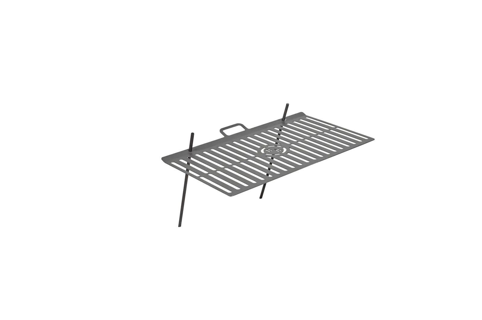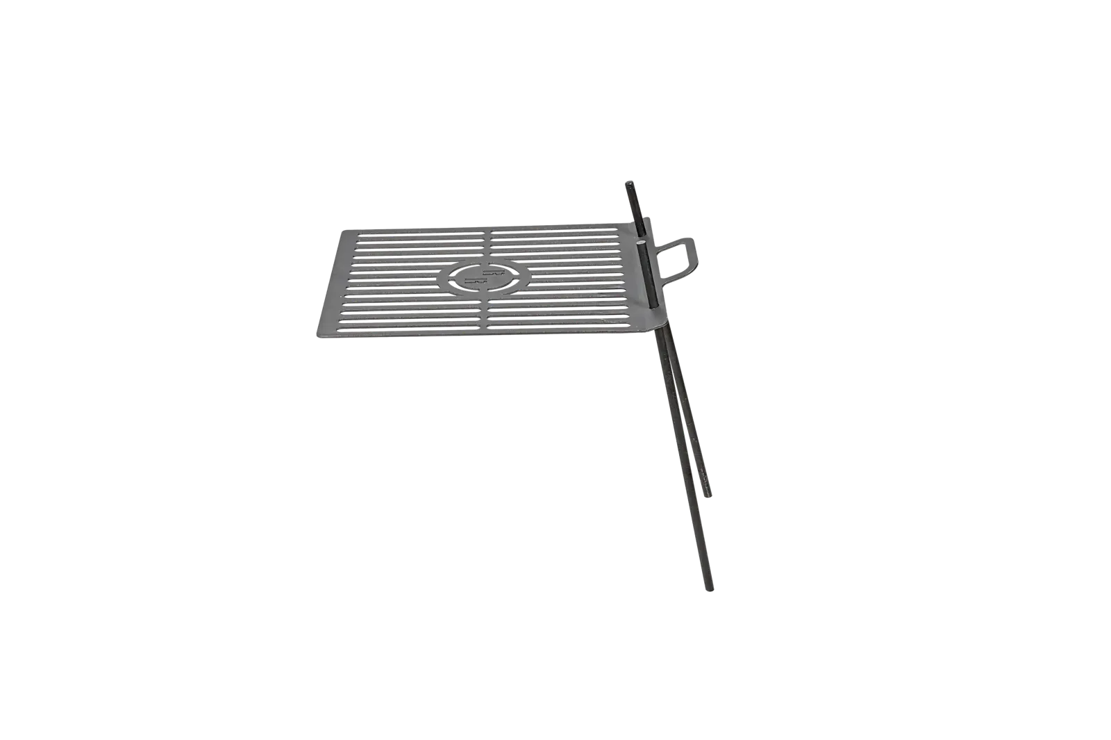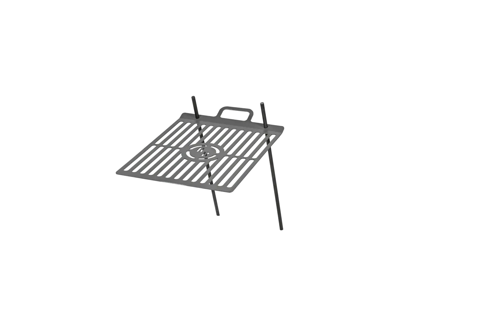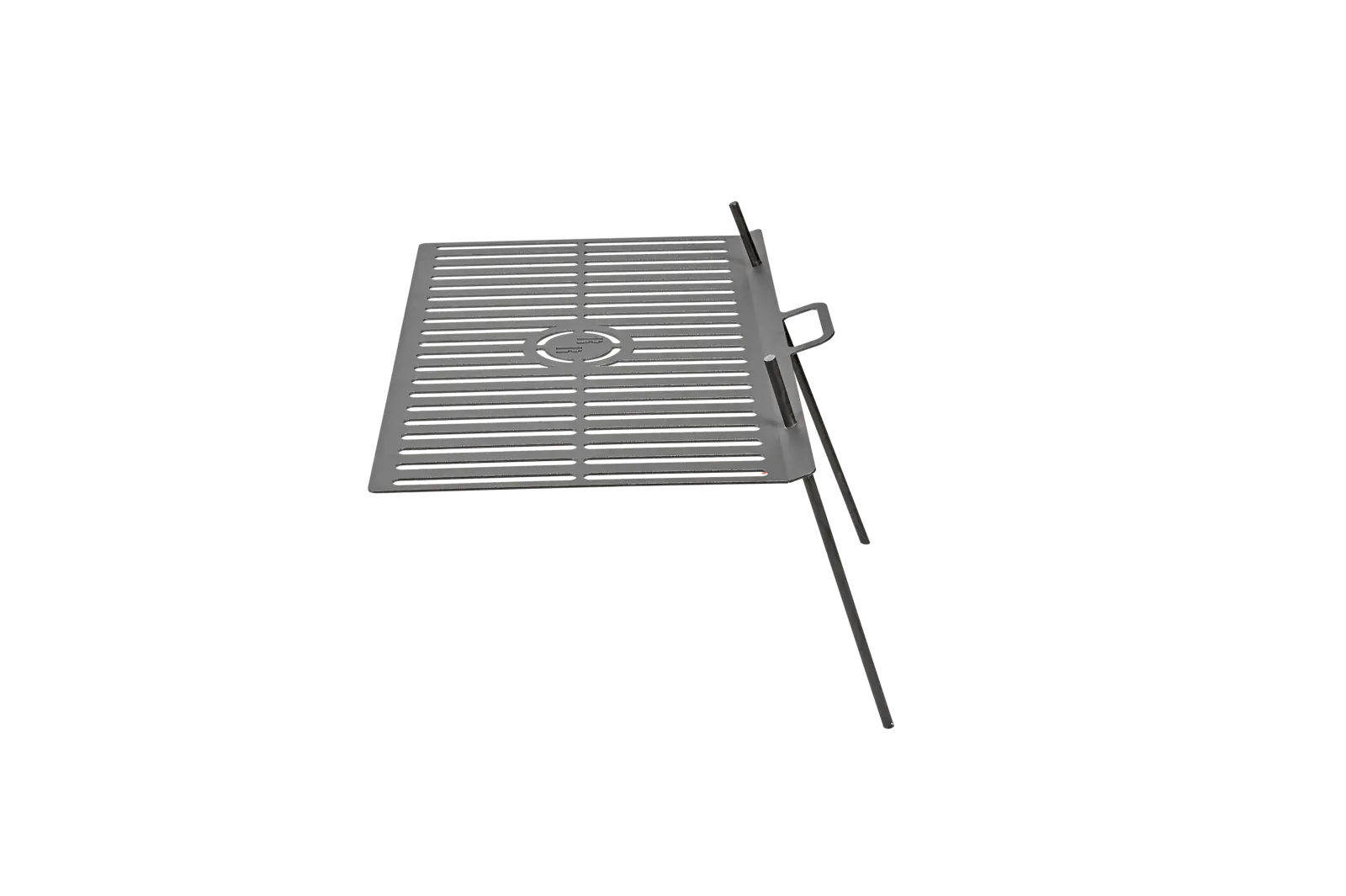 A rács két földbe szúrható pálcával rögzíthető a talajhoz, így stabilan elhelyezhető a tűz fölé.